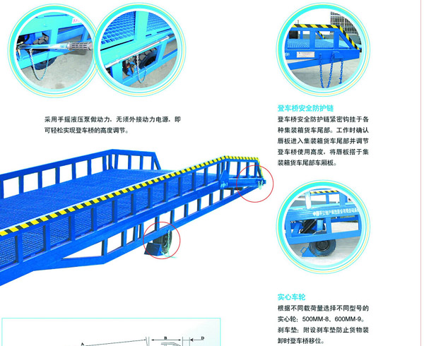 移動(dòng)式登車橋是與叉車配合使用的貨物裝卸輔助設(shè)備,可根據(jù)貨車車廂的高低調(diào)節(jié)高度,叉車可以直接通過本設(shè)備駛?cè)胲噹麅?nèi)部進(jìn)行貨物的批量裝卸,僅需單人作業(yè),即可實(shí)現(xiàn)貨物的快速裝卸。它的菱形網(wǎng)狀結(jié)構(gòu),充分保證了卓越的防滑性能,使叉車有極好的爬坡性和可操縱性。即使在雨、雪天氣,仍能保證正常使用。它的可調(diào)節(jié)長度的索鏈能方便地鉤住貨車,使登車橋與貨車始終緊密貼合。采用手搖液壓泵作動(dòng)力,不需外接動(dòng)力電源即可輕松實(shí)現(xiàn)登車橋的高度調(diào)節(jié)。配置的剎車墊可有效防止貨車裝卸時(shí)登車橋移位。